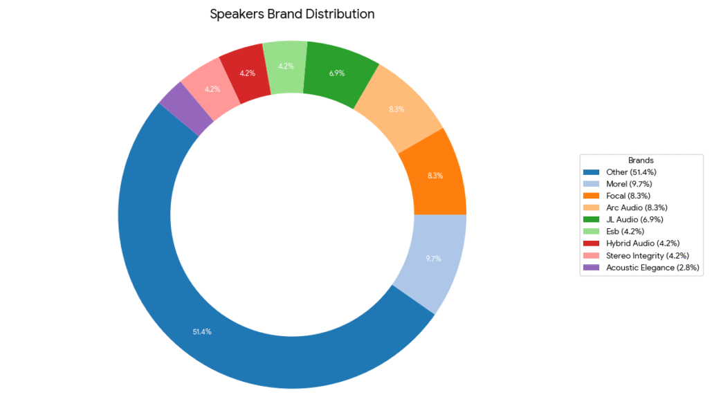 Speaker brands are well represented, with Morel, Focal, and Arc Audio appearing in over 25% of competitor vehicles.