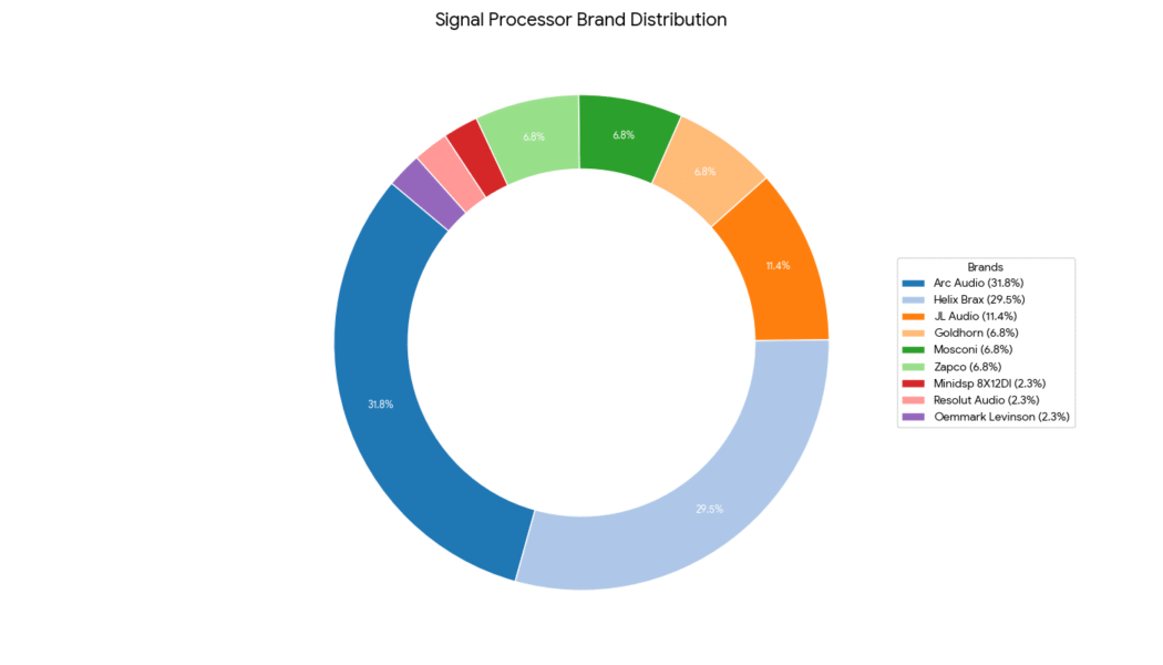 Helix and Arc Audio are the clear winners in the signal processor category, capturing over 60% of competitor vehicles in an essentially 50/50 split. Goldhorn, a relative newcomer in North America, tying with Mosconi, and Zapco fourth spot in the processor category!